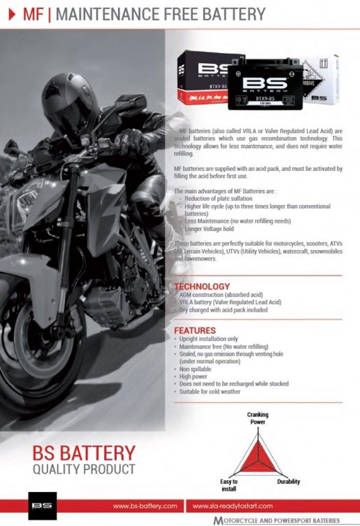 Uzavřené bezúdržbové baterie, které využívají technologii plynové rekombinace. Tato technologie snižuje nutnost údržby, protože není nutné doplňovat vodu. Baterie je dodávána spolu s kyselinou, kterou je potřeba před první použitím nalít, a tím baterii aktivovat. Tyto baterie jsou vhodné pro motocykly, skútry, čtyřkolky, ale i sněžné skútry nebo plavidla.