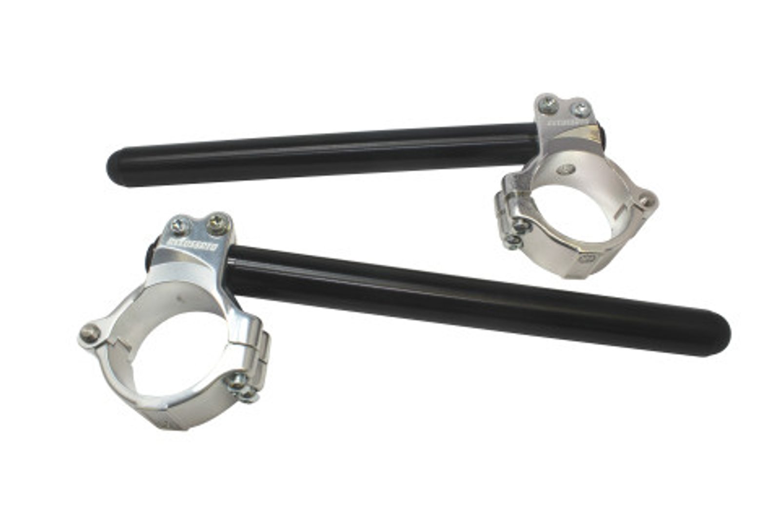 Řídítka ACCOSSATO CNC obráběná, dodávaná s kovovou objímkou složenou ze dvou polokruhů, s úhlem náklonu 10°.