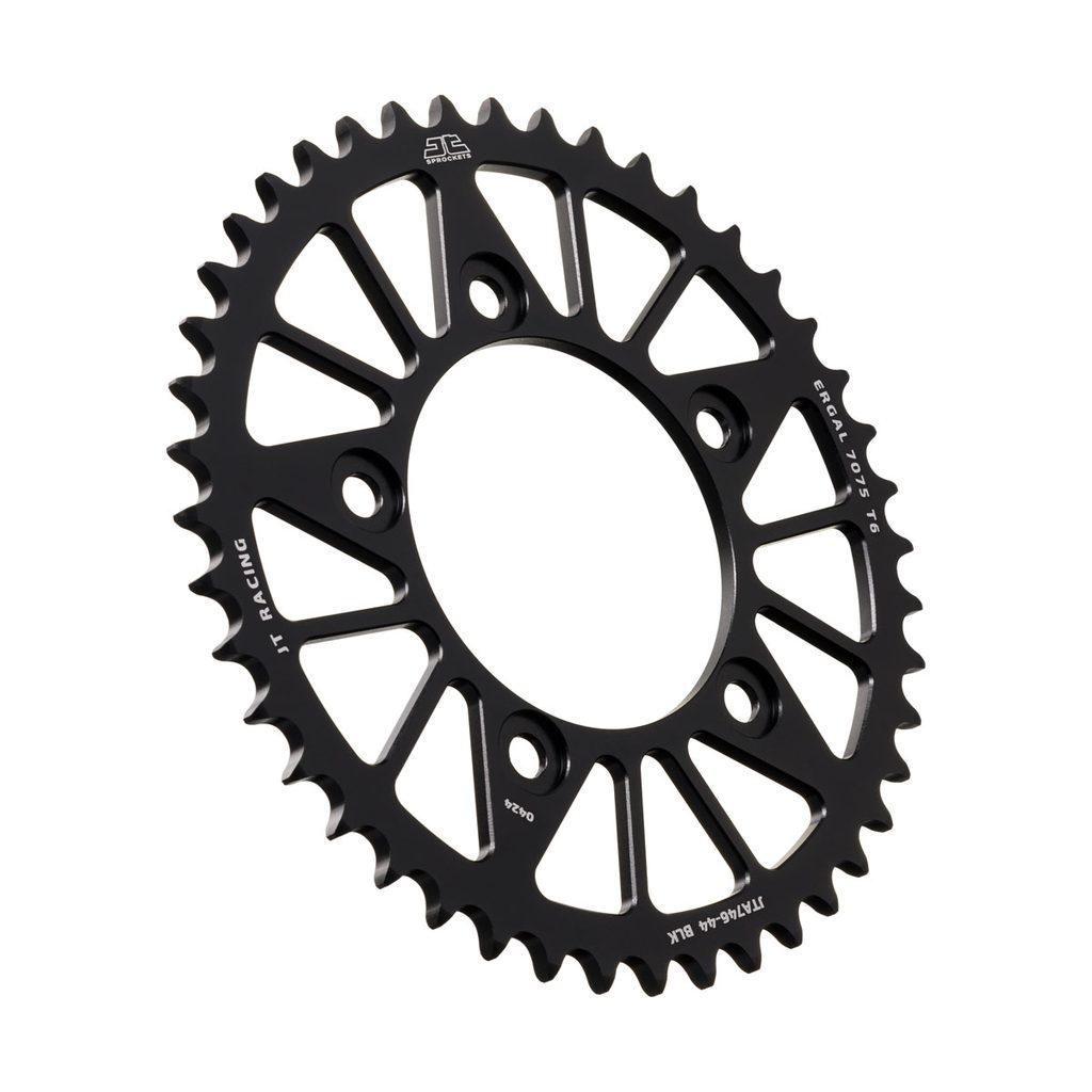 JT používá výhradně ty nejkvalitnější materiály. Pro závodní lehké rozety je to hliníková slitina letecké kvality 7075-T6, pro přední pastorky extrémně pevná slitina SCM420 (chrom-molybdenová ocel) a pro zadní ocelové rozety jako jediný výrobce používá ultra odolnou uhlíkovou ocel C49.