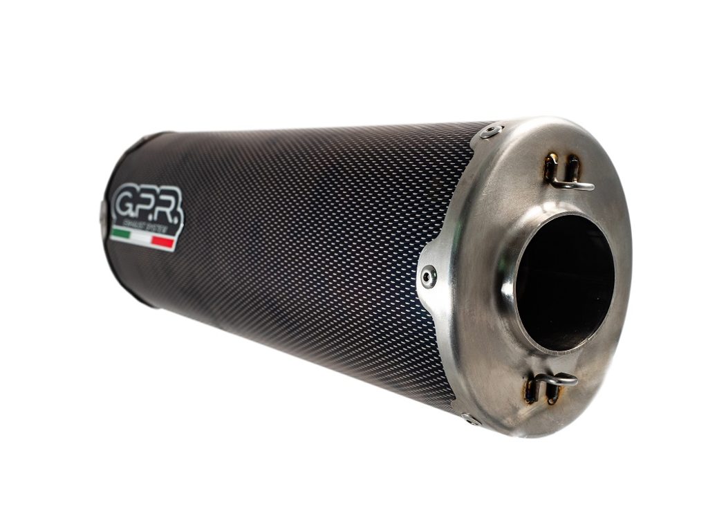 Koncovka výfuku Slip-on GPR DUAL E4.K.179.DUAL.PO Karbonový vzhled zahrnuje spojovací svod a odnímatelný dB killer
