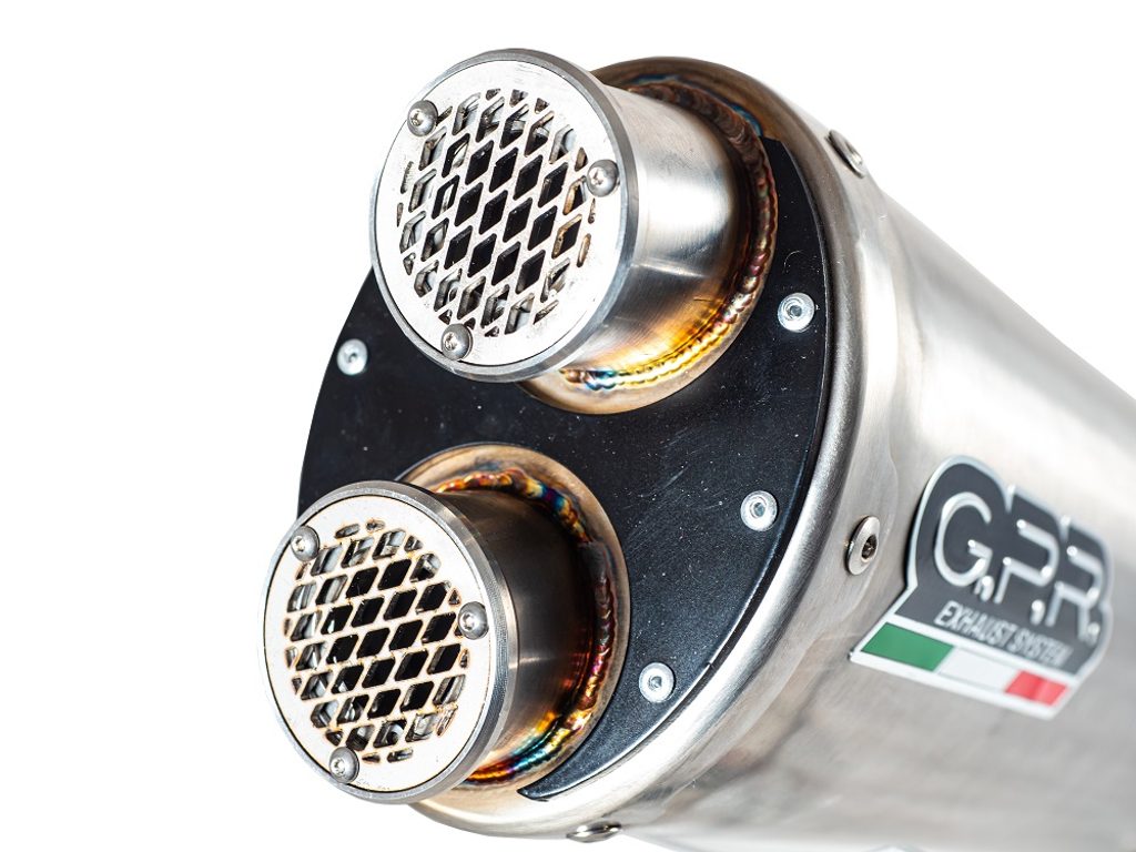 Koncovka výfuku Slip-on GPR DUAL E5.A.77.DUAL.IO Matný nerez zahrnuje spojovací svod a odnímatelný dB killer