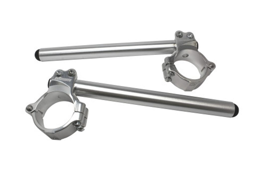 Hliníková kovaná clip-on řídítka ACCOSSATO s kovovou objímkou ze dvou půlkruhů, úhel sklonu 10°.