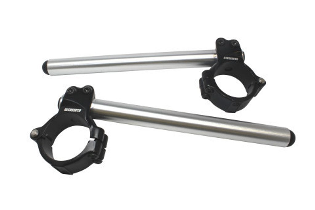 Hliníková kovaná clip-on řídítka ACCOSSATO s kovovou objímkou ze dvou půlkruhů, úhel sklonu 10°.