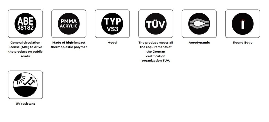 Plexi má zaoblené hrany, což zajišťuje maximální bezpečnost a splňuje německé normy TÜV.