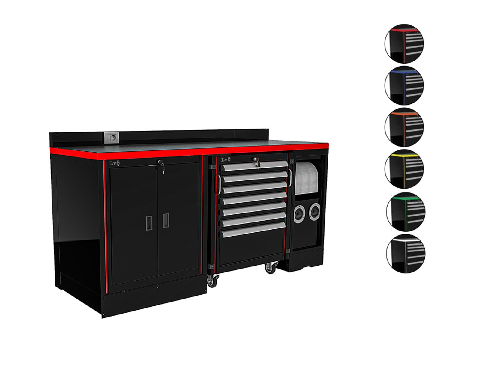 L 2000mm Workbench with L 800mm. Cabinet with 2 doors, L 800mm. Under table trolley with 7 drawers, L 400mm Cabinet with predisposition for 2 hose reels and paper holder compartment, H 100mm. Bottom closing panel with electric socket, Worktop and Anti-Petrol and Anti-Oil ABS Worktop cover.