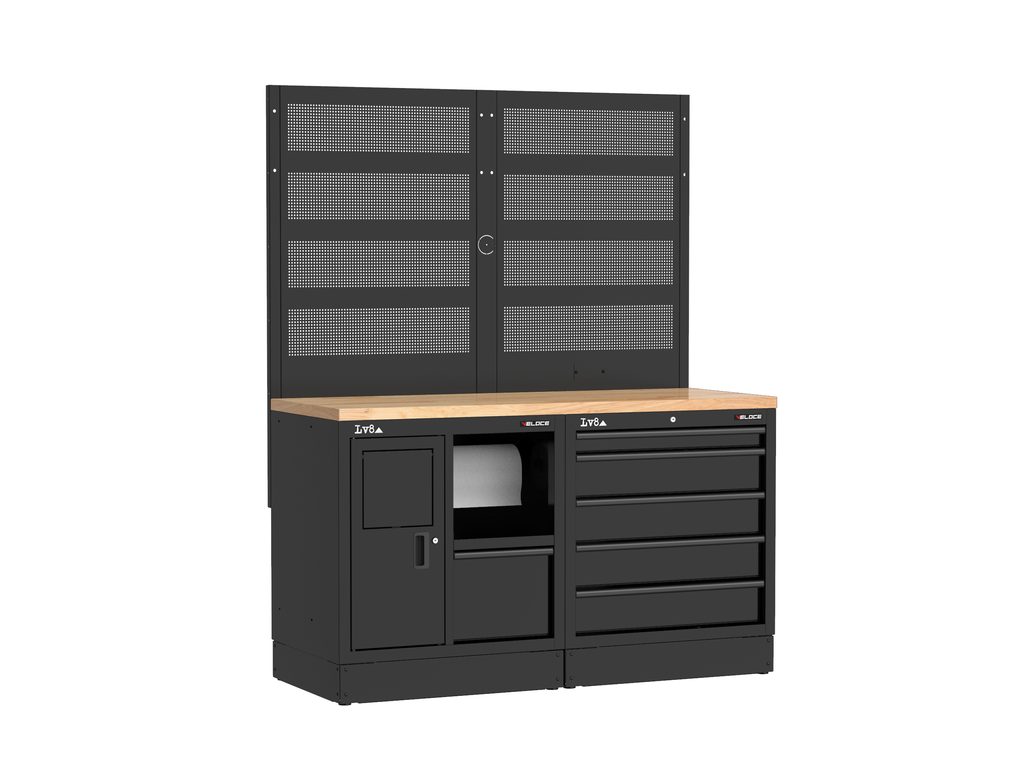 Pracovní stůl délky 1600 mm se servisní skříňkou s odpadkovým košem, přihrádkou na papír a úložnou zásuvkou, a 5 zásuvkovou skříňkou se zámkem. Masivní dřevěná pracovní deska, dvojitý perforovaný panel na nářadí a dvojitá příprava pro elektrickou zásuvku. K dispozici také v provedení s nerezovou nebo melaminovou deskou.