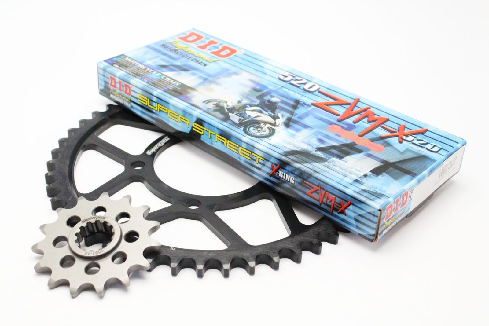 Řetězová sada - Řetěz D.I.D, řady ZVM-X ve zlaté barvě, těsněný X-Kroužkem. Ocelové kolečko a rozeta SUPERSPROX. Více informací