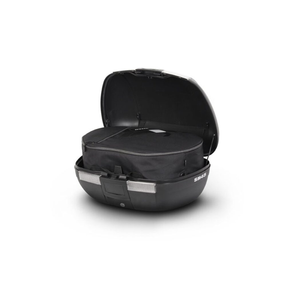 Vrchní kufr SH45 je robustní vrchní kufr vyrobený z vysoce kvalitního tvrzeného polypropylenu. Tento kufr je schopný odolat extrémním teplotám, sněhu i dešti a zároveň chrání obsah před nárazy a poškozením. Je vhodný pro jízdy ve městě i na delší výlety na skútrech, středních i větších motorkách, vejdou se do něho 2 integrální helmy, má zaoblený tvar a kouřové odrazky.